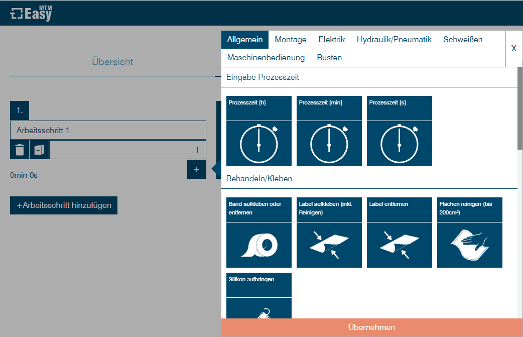 Erstellen Sie schnell und einfach Arbeitspläne oder bewerten Sie Prozesse hinsichtlich der wertschöpfenden Teile.